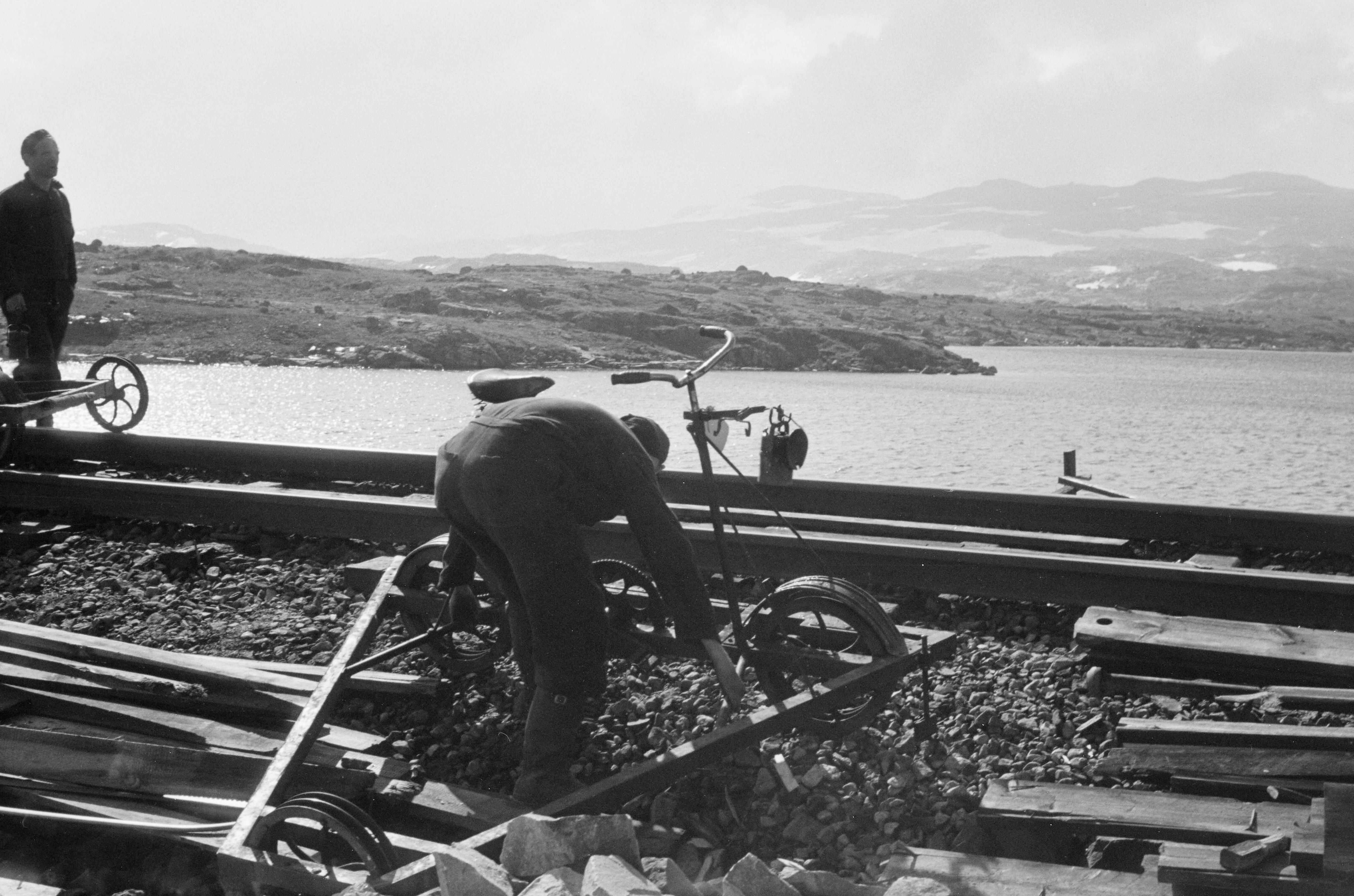 Dette bildet er knyttet til emnene Bergensbanen, Dresin, Jernbaneskinner, Mann