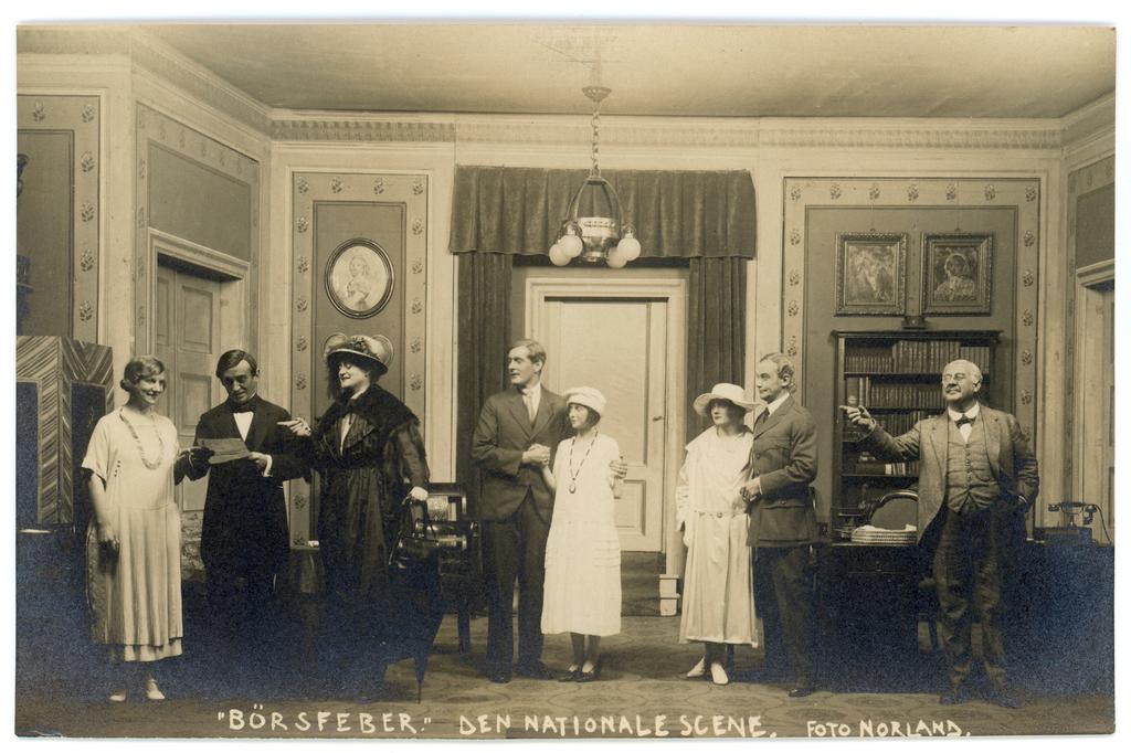 Eldre forestillingsfoto fra produksjonen av "Børsfeber" av Max Reimann and Otto Schwartz. Produksjonen hadde premiere 31. august 1923.