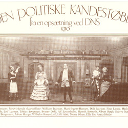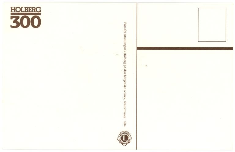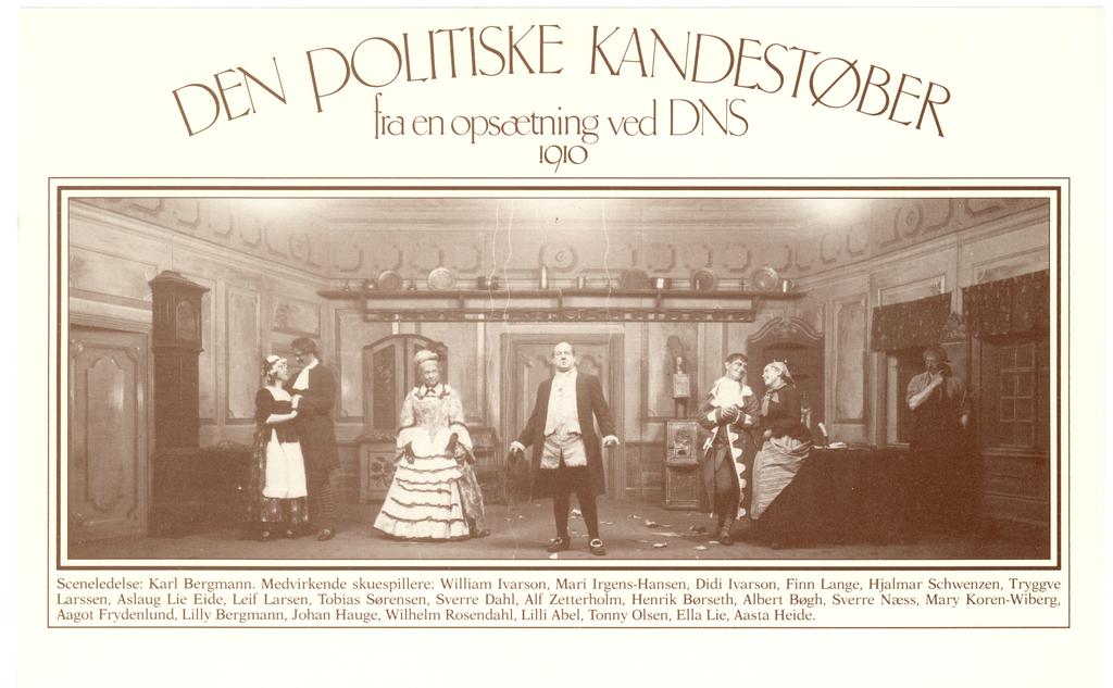 Postkort fra utstillingen "Holberg på den bergenske scene" ved Teatermuseet i Bergen 1984, med forestillingsfoto og rolleliste fra produksjonen av "Den politiske kandestøber" av Ludvig Holberg. Produksjonen hadde premiere 7. oktober 1919.