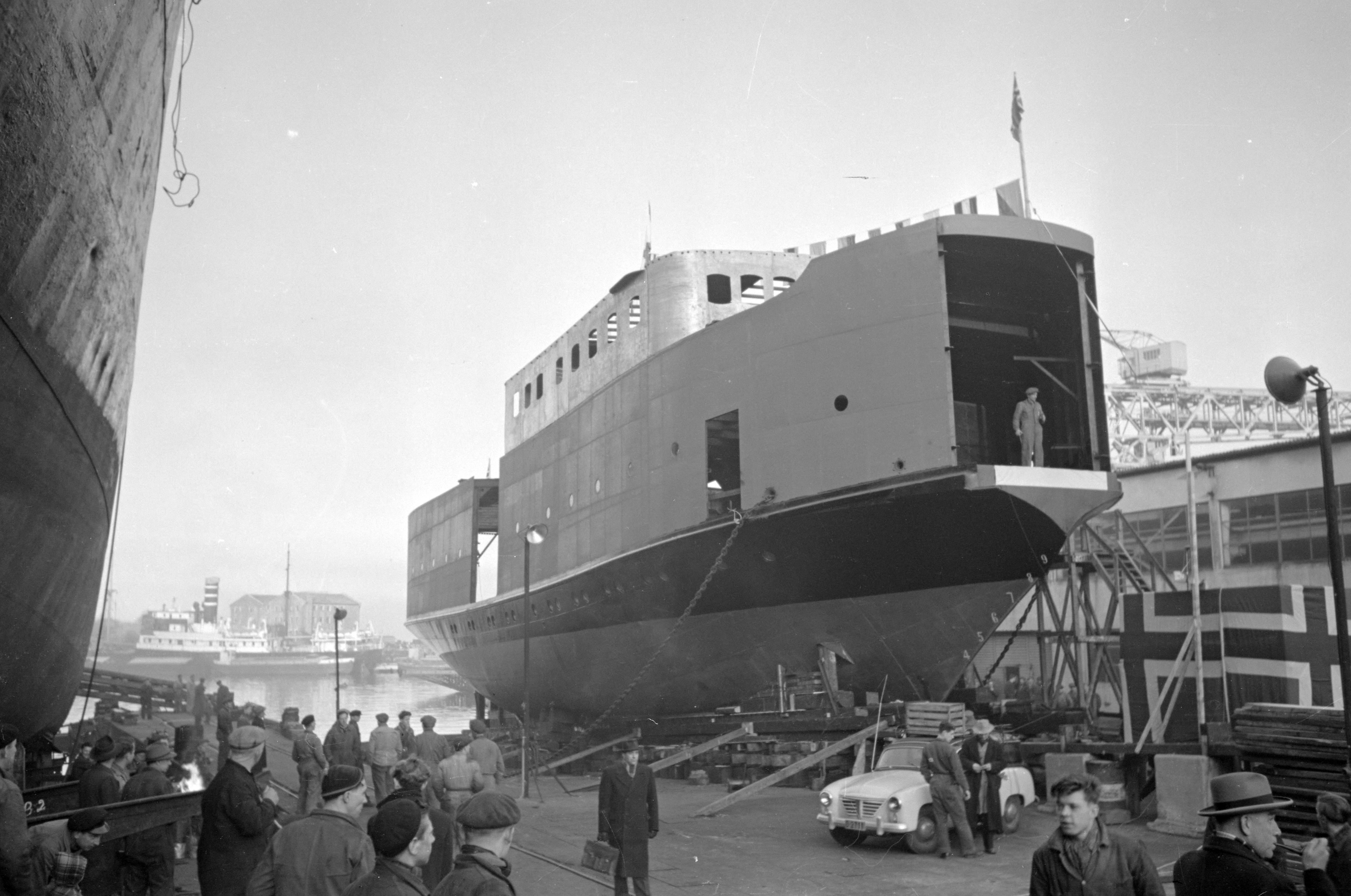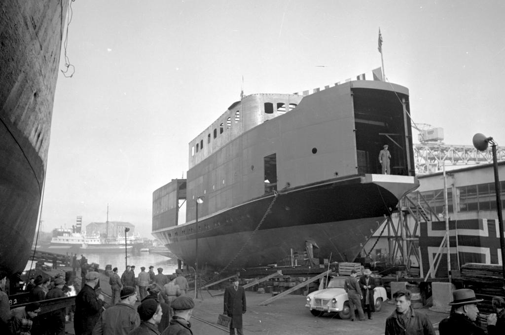 Dette bildet er knyttet til emnene Ferge, Skipsdåp, Skipsverft