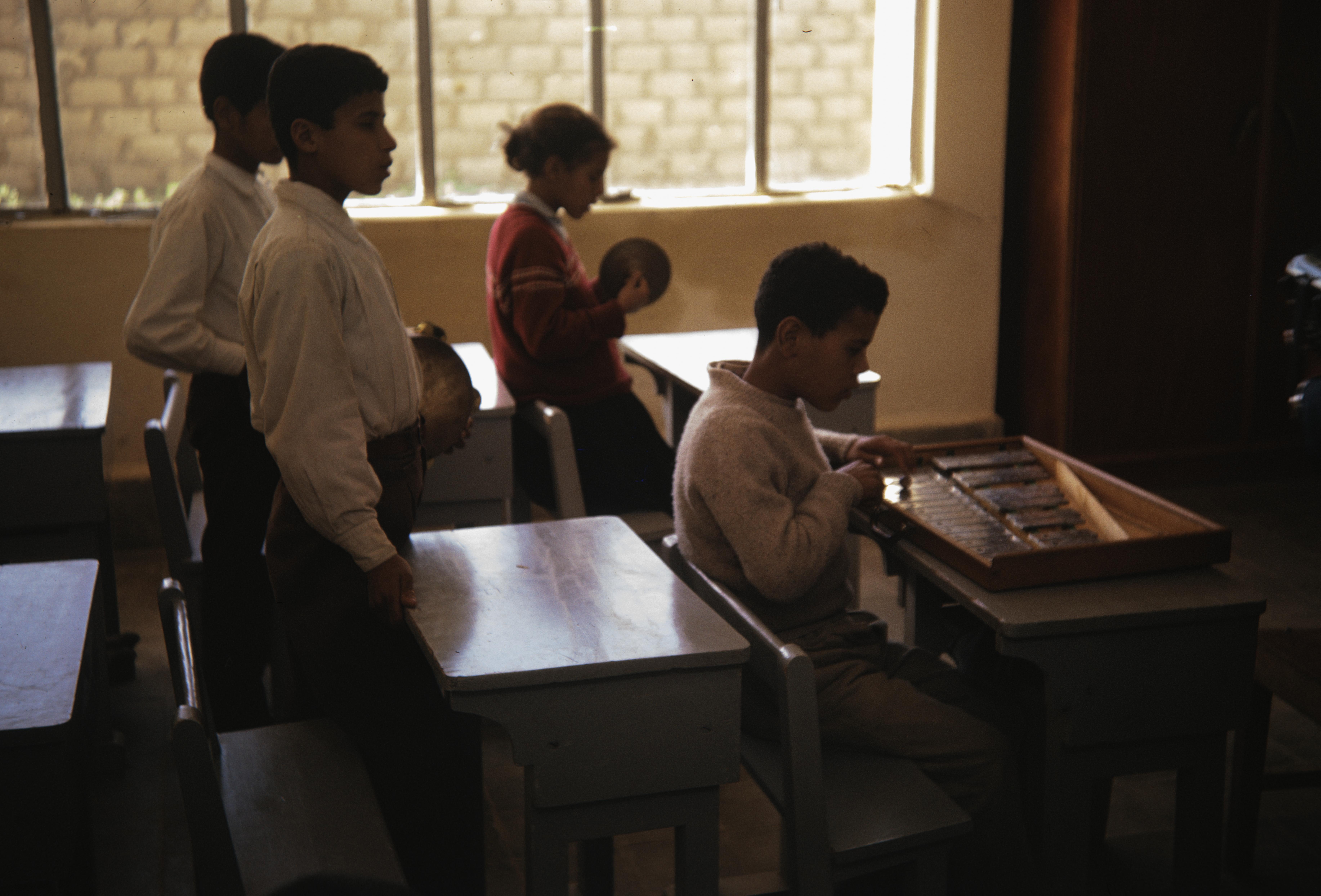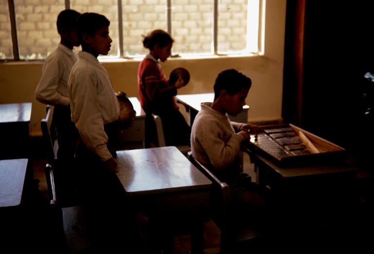 Dette bildet er knyttet til emnene 35 mm, Blind, FN, Fargefotografi, Instrumenter, Klasserom, Lysbilde, Skoleelev, UNRWA