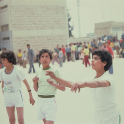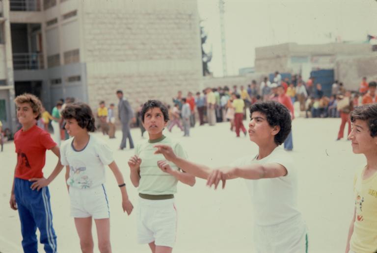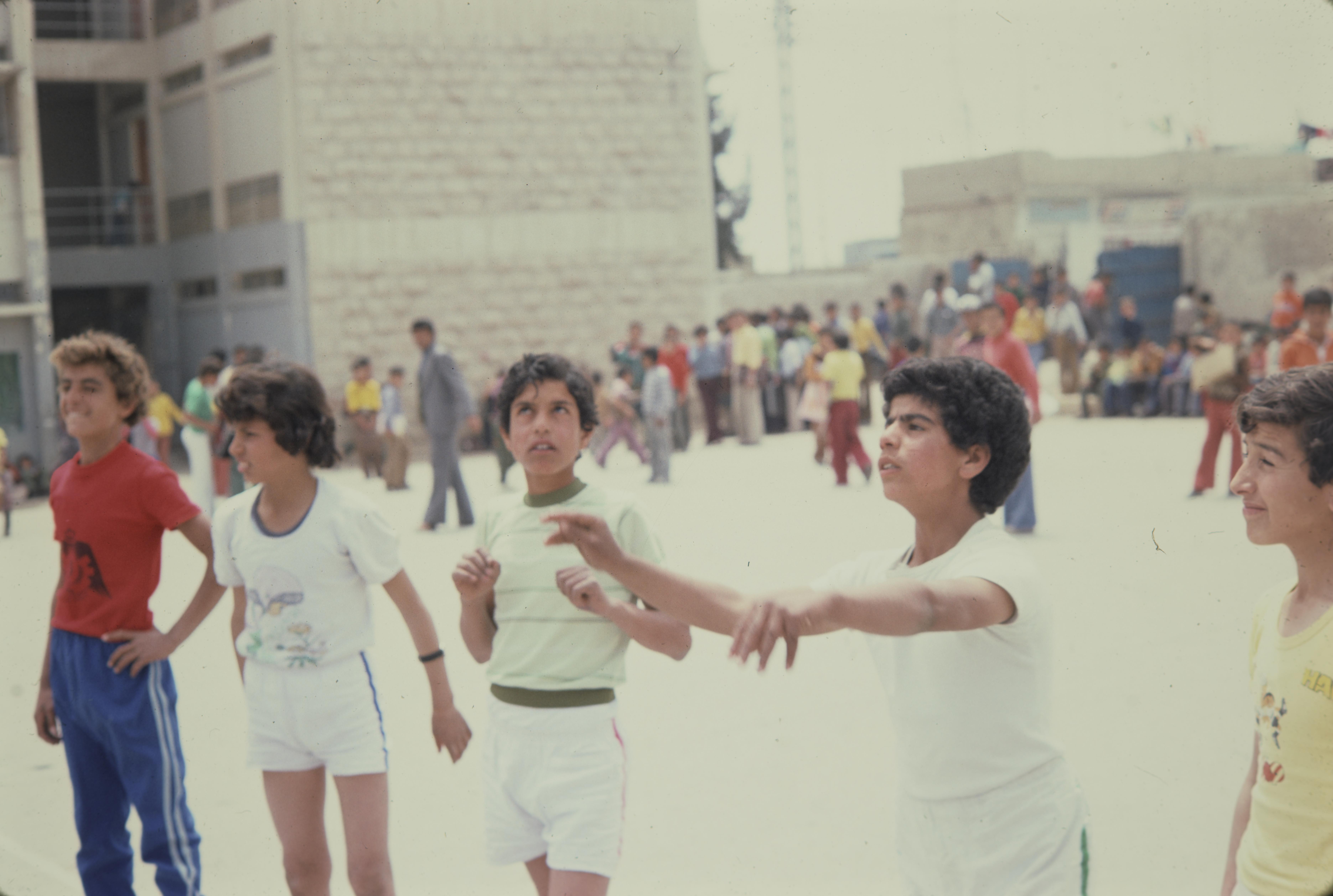 Dette bildet er knyttet til emnene 35 mm, FN, Fargefotografi, Folkemengde, Gutt, Lysbilde, Skolebygning, Skoleelev, UNRWA