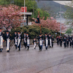 Sydnæs Bataljonen marsjerer opp fra Kleppestø kai, Askøy på vei til åpning av NM i friidrett (2.-4.. aug) på Ravnanger Friidrettsbane hvor korpset hadde oppdrag som åpningsnummer. ...