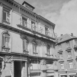 Hjørnebygget mellom Christies gate og Nygårdsgaten. Reklameskilt i vinduet for blomsterhandler Anton Bastiansens Eftf. Oppdragsgiver Frimanslund.