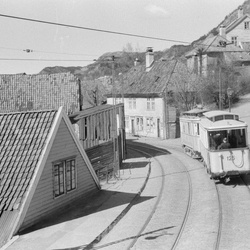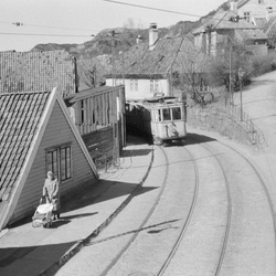 By- og småsteder, Kvinne, Woman, Barnevogn, Pram, Bolighus, House, Trehusbebyggelse by, Wooden house settlement, Tram rails, Trikkeskinner, Tram, Trikk