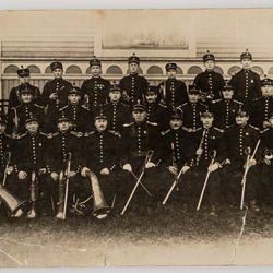 Kortet signert 19.12.1923. På baksiden står det "Harstad Militærkorps. I første rekke i midten er Evensen som også har vært i Bergen". Signert Rino Johnsen