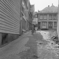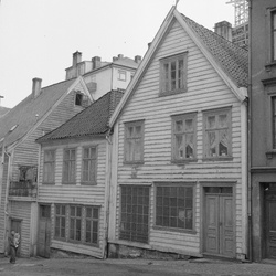 Huset med lykt er Nordre Schreudersmug 4, deretter nr. 6. Lengst til høyre er Søndre Griegsmug, huset med den spisse gavlen er nr. 2.