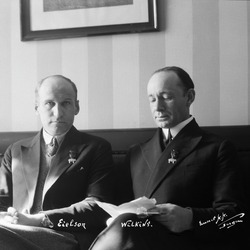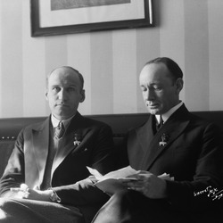 Løintnant Eielson og kaptein Wilkins på Hotel Norge etter ankomst til Bergen. Bergens Arbeiderblad.