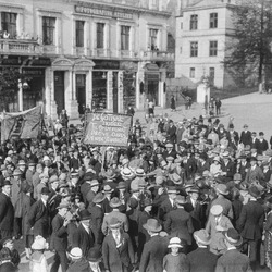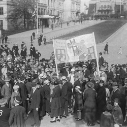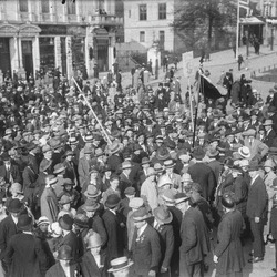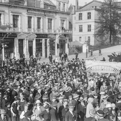 Ole Bulls Plass om ettermiddagen. Folk venter på den offisielle kunngjøringen om at krigen er slutt.