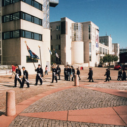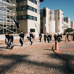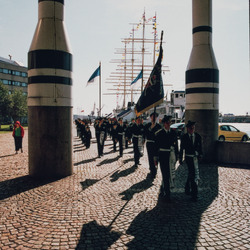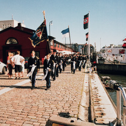 Buekorps, Bow corps, Bow corps uniform, Buekorpsuniform, Harbour, Havn, Marching, Marsjere, Brostein, Cobblestone, Fane, Banner, Gallauniform