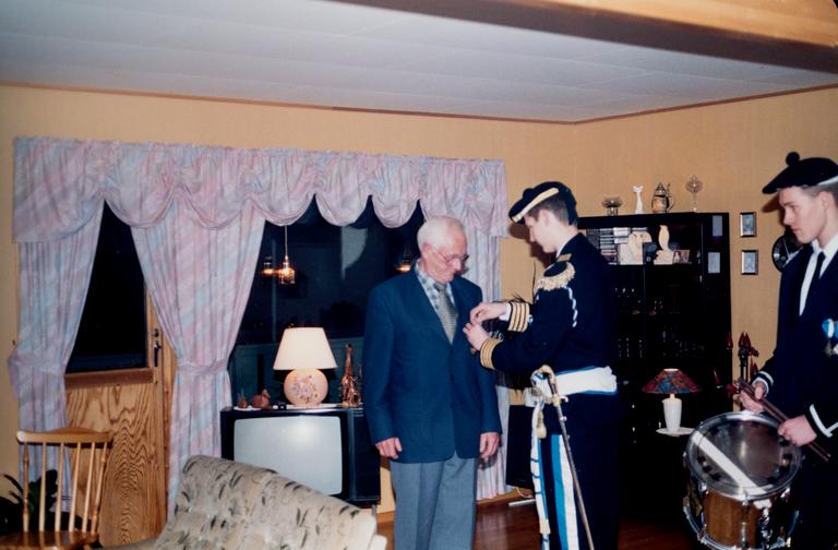 Interiør, Buekorpsgutter, Buekorpsuniform, Stue, rom, Gardiner, Medalje, TV, Buekorpssjal, Gallatromme