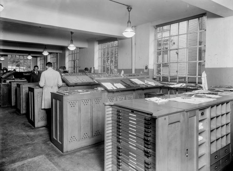 Arbeider, Worker, Avis, Newspaper, Taklampe, Printing house, Trykkeri, Settekasse, Bladekspeditioner