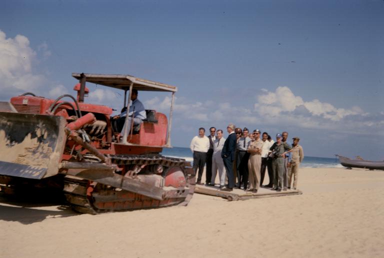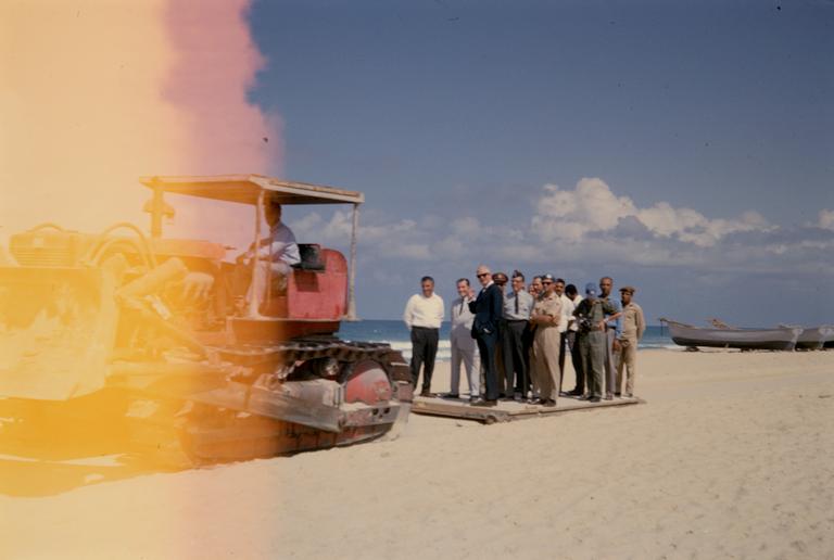 Soldat, Mann, Gruppe, Fargefotografi, Lysbilde, 35 mm, Strand, Gravemaskin, FN, UNRWA, الأونروا