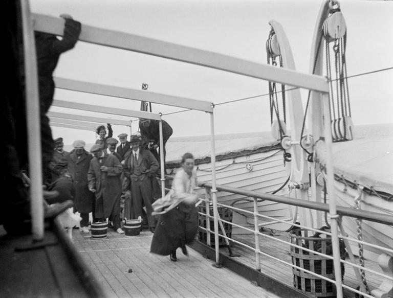 Passanger ship, Passasjerskip, Mann, Man, Skipsdekk, Kvinne, Woman, Lifeboat, Livbåt, Selskapslek