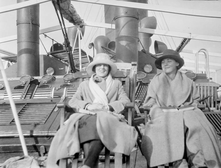 Passenger, Passasjer, Passanger ship, Passasjerskip, Skipsdekk, Avis, Newspaper, Kvinne, Woman, Lesing, Reading, Dress, Kjole, Casual wear, Hverdagsklær, Fjordabåt, Dameveske, Handbag