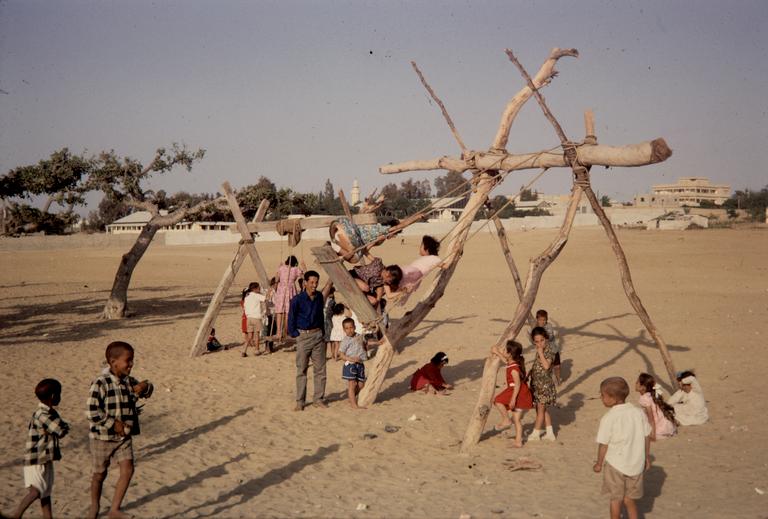 Barn, Children, Bygninger, Buildings, Mann, Man, Colour photography, Fargefotografi, FN, UN, UNRWA, الأونروا, Lysbilde, 35 mm, Barnehage, Kindergarten, Huske, Swing