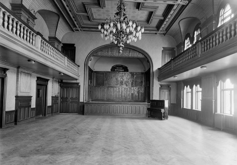 Interiør, Interior, Gruppeportrett, Group portrait, Mann, Man, Fane, Banner, Hall, Sal